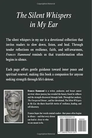 The Silent Whispers in My Ear is a reflective, soul-centered book that encourages readers to reconnect with their inner voice in a world filled with noise and distraction. Drawing from lived experience, faith, and personal healing, the book offers gentle reflections designed to meet readers where they are—especially those navigating illness, loss, burnout, or life transitions.